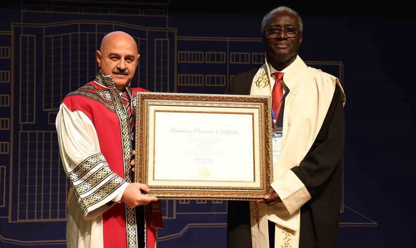Açılış konuşmalarının ardından Southern Üniversitesi ve A&M Koleji Rektör Yardımcısı Prof. Dr. Patrick Mensah'a, Türk yükseköğretimine katkıları ve akademik çalışmaları nedeniyle mühendislik alanında "Fahri Doktor" unvanı verildi. Rektör Prof. Dr. Nedim Sözbir tarafından cübbesi giydirilen Mensah, fahri doktora belgesinin takdim edilmesinin ardından bir sunum gerçekleştirdi ve Düzce Üniversitesi'nde bulunmaktan memnuniyet duyduğunu ifade etti.