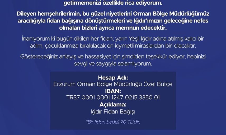 • Dileyenlerin niyetlerini Orman Bölge Müdürlüğü aracılığıyla fidan bağışına dönüştürmesi çağrısı.