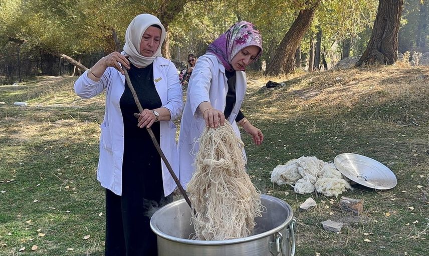 Toplanan yünler, önce yıkanıp kurutuluyor, ardından geleneksel aletlerle ip haline getiriliyor. İpler, ceviz kabuğu, pancar ve aspir gibi bitkilerin kökleri ile bir araya getirilerek kazanlarda kaynatılıyor. Bu işlem sayesinde doğal renklere kavuşan ipler, dokumacılıkta kullanıma hazır hale geliyor.