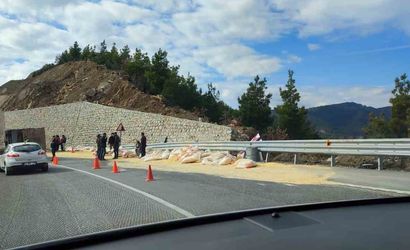 Yem yüklü tır Demirkapı Tüneli girişinde devrildi: 2 yaralı