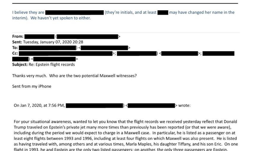 E-postada, 1993 yılındaki bir uçuşta listelenen tek iki yolcunun Trump ve Epstein olduğu; başka bir uçuşta ise listede Epstein, Trump ve o dönemde 20 yaşında olan bir kişinin bulunduğu bilgileri de yer alıyor. Bazı uçuşlarda yolculardan ikisinin Maxwell davasında olası tanık olabilecek kadınlar olduğuna işaret edilirken, kayıtların "100 sayfadan fazla ve çok küçük puntolu" metinlerden oluştuğu kaydedildi. E-posta gönderen ve alıcı bilgileri karartılmış şekilde paylaşılırken, mesajın altında New York Güney Bölgesi’nden bir yardımcı ABD savcısının unvanı görüldü.