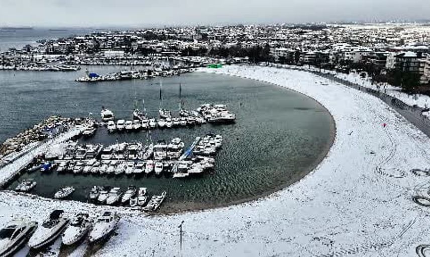Havadan elde edilen görüntüler, kıyı çizgisinin ve sahilin karla kaplanmış halini gözler önüne serdi ve kışın oluşturduğu atmosferi ortaya koydu.