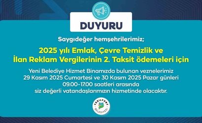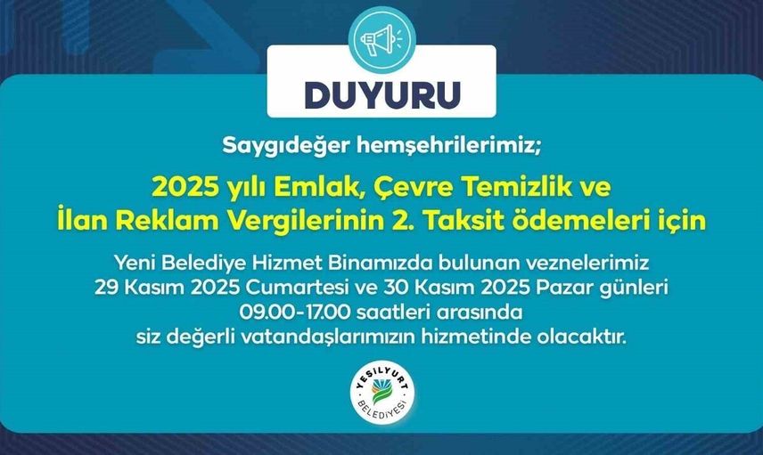 Yeşilyurt Belediyesi Gelirler Müdürlüğüne bağlı vezneler, 2025 yılı Emlak, Çevre Temizlik ve İlan Reklam Vergisi 2. Taksit ödemelerini yapacak vatandaşlara kolaylık sağlamak amacıyla hafta sonu da hizmet verecek.
