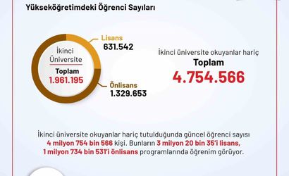 Yükseköğretim sistemine kayıtlı 6,7 milyon öğrencinin 1 milyon 961 bin 195'i ikinci üniversite öğrencilerinden oluşuyor. İkinci üniversite öğrencilerinin 631 bin 542'si lisans, 1 milyon 329 bin 653'ü önlisans programına kayıtlı. İkinci üniversite öğrencileri hariç tutulduğunda güncel öğrenci sayısı 4 milyon 754 bin 566 olarak gerçekleşiyor; bunların 3 milyon 20 bin 35'i lisans, 1 milyon 734 bin 531'i önlisans düzeyinde eğitim görüyor.