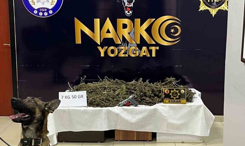 Yozgat İl Emniyet Müdürlüğü Narkotik Suçlarla Mücadele Şube Müdürlüğü ekipleri, Yozgat Cumhuriyet Başsavcılığı koordinesinde bir ikamette adli arama gerçekleştirdi. Aramada toplam 7 kilo 50 gram esrar ile bir ruhsatsız tabanca ele geçirildi.
