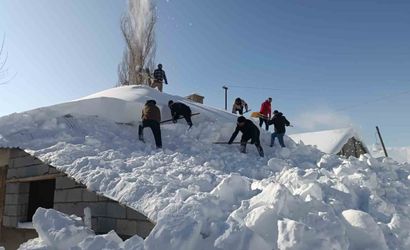 Hakkari’nin Yüksekova ilçesine bağlı Beşatlı köyünde etkili olan yoğun kar yağışının ardından, köy sakinleri cami ve tek katlı evlerin çatılarına biriken karı imece usulüyle temizledi.