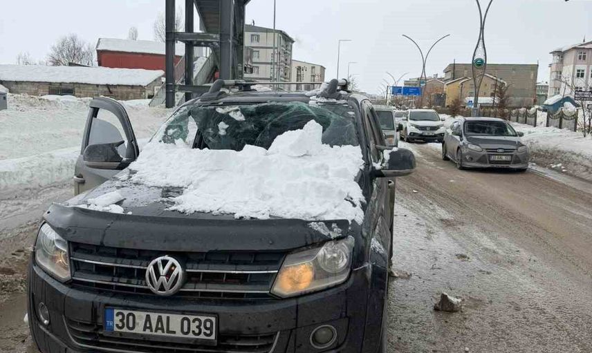Yüksekova'da üst geçitten düşen kar kütlesi kamyonetin ön camını kırdı