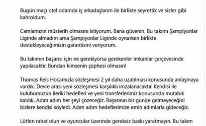 Thomas Reis ile sezon sonunda bitecek mevcut sözleşmenin uzatılması konusunda anlaşmaya vardıklarını açıklayan Yıldırım, sözleşmenin 2 yıl daha devam edeceğini ve devre arasında karşılıklı imzalanacağını söyledi. Kulüp ile teknik ekip arasındaki hedef birliği ve yeni transferler konusunda mutabakata varıldığını belirterek başarının zaman alacağını, adım adım hedeflere ulaşılacağını ifade etti.