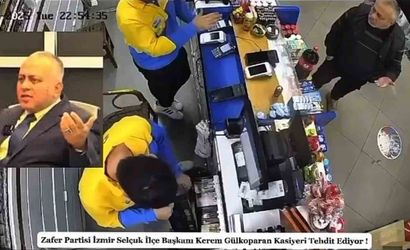 İzmir'in Selçuk ilçesinde, Zafer Partisi Selçuk İlçe Başkanı Kerem Gülkoparan'ın, ilçe girişinde bulunan bir benzin istasyonunun market bölümünde görev yapan kasiyere yönelik tehditleri güvenlik kameralarına yansıdı.